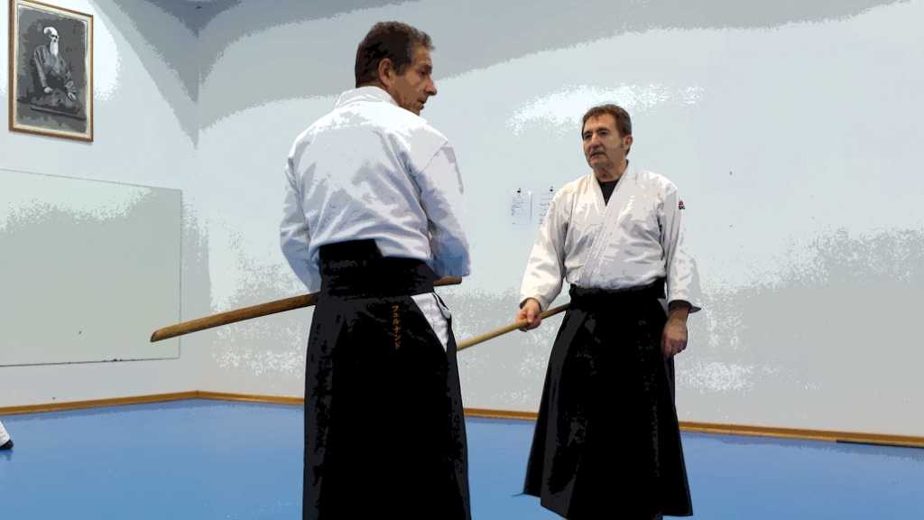 Gran parte de la clase estuvieron trabajando Jo Do; diferentes técnicas de Jo contra Bokken, un poco alejadas de la práctica habitual en el Aikido, pero muy interesantes por la movilidad y precisión exacta que requieren.